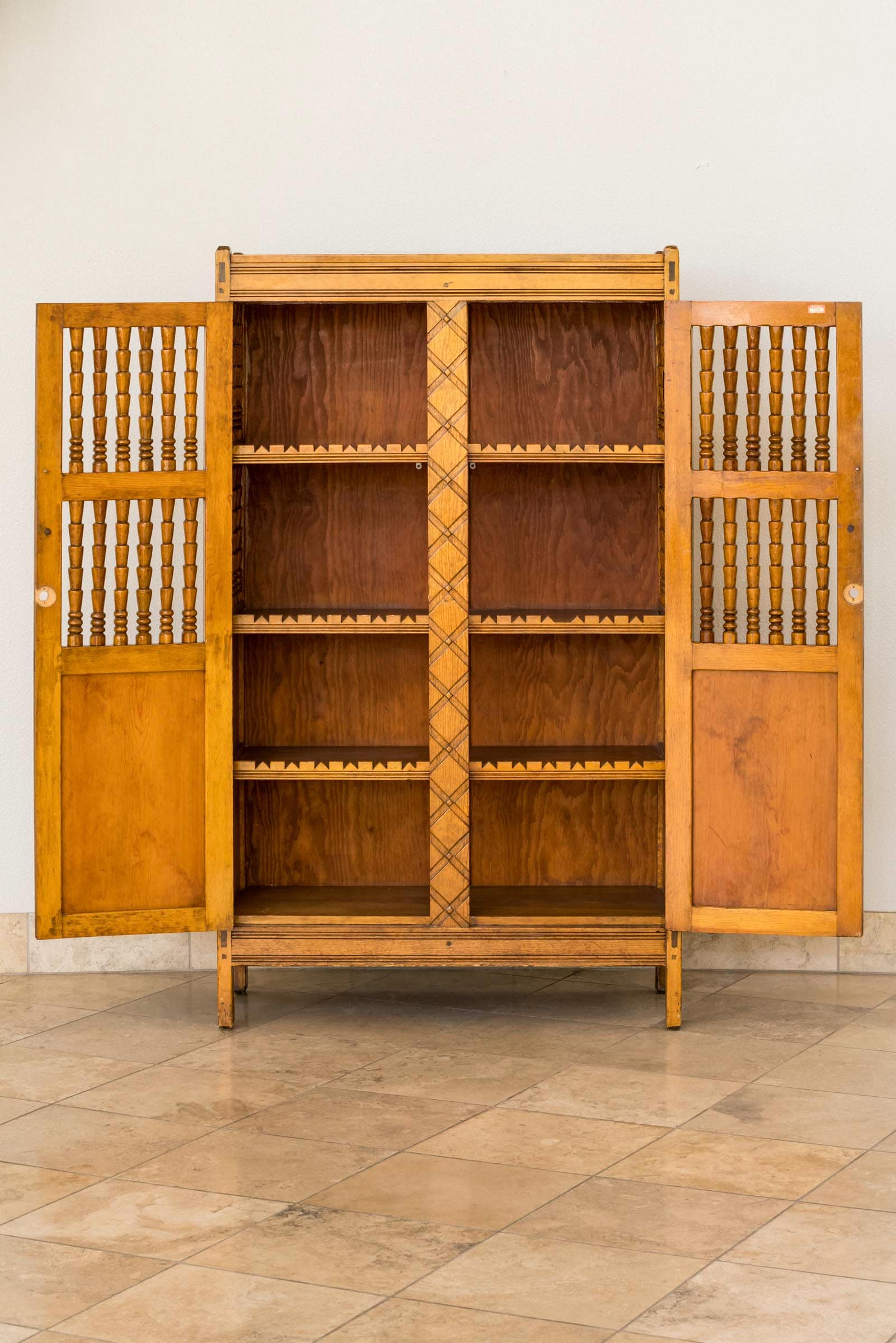 This trastero (cabinet) was likely produced by Elidio Gonzales at the Taos Vocational School, a New Deal workshop. It is a fine work of art, thoughtfully conceived and very skillfully executed—notice the clarity and uniformity of its hand-carved pattern—yet its maker was not credited at the the time of the New Deal. It was only relatively recently that Gonzales’s identity as a New Deal artist was recovered by scholar Tey Marianna Nunn1 and credit for this piece able to be at least tentatively assigned to him.