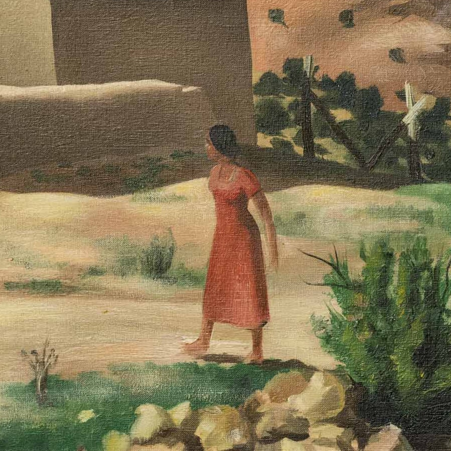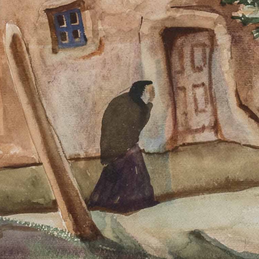 The Magdalene is easily identifiable in iconography because she is usually portrayed as a young woman, dressed in red, with her hair uncovered and unbound—exactly as the lone woman appears in Paul Lantz’s Church in the Rio Grande Valley. Historically—and mistakenly—Mary Magdalene was viewed as the repentant prostitute, as someone outside of institutional norms. Likewise, in the painting, the woman here appears outside and at some distance from the church. However, in the Gospel, after Jesus healed Mary Magdalene, she became one of his closest followers and sources of support. She, along with the Virgin Mary, is often shown at the foot of the cross in traditional images of the crucifixion, and she was the first to see the Risen Christ, announcing the resurrection to the others, which earned her the title of Apostle to the Apostles. While Lantz’s woman in red is clearly pictured outside the church itself, consider the steeple, which Christian imagery considers “the finger of God.” Notice how its shadow points discreetly at the woman, calling attention to her. Look closer and you’ll notice her vibrancy. She is full of life and movement, almost appearing to dance on the earth. The significant yet unsung role of Mary Magdalene in the life of Christ poignantly exemplifies the often unspoken value of women to the spiritual life in the Hispanic villages of New Mexico.